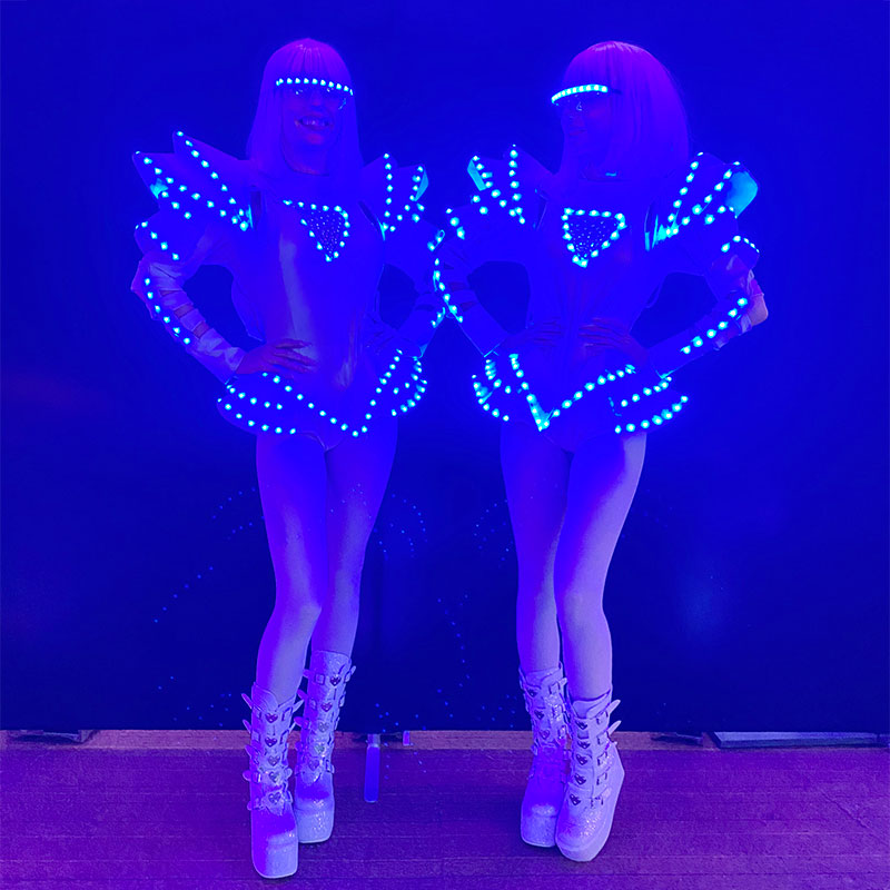 Hôtesses / Danseuses FuturisteImpressionnez vos invités avec une soirée Futuriste animée par nos hôtesses et/ou danseuses arborant des costumes lumineux résolument futuristes. Offrez un spectacle visuel époustouflant pour accueillir vos convives et créer des moments mémorables lors des séances photo. Hôtesses d'Accueil en Costume LED Futuristes • A partir de 2 hôtesses • Durée de la prestation : 1 heure d'accueil Ambianceuses avec costumes à thème Futuriste LED • A partir de 2 danseuses Futuristes • Durée de la prestation : 3 passages de 5 à 8 minutes chacun sur podium A votre charge : Repas et loge équipée d'une grande table et de chaises. Ajoutez une touche unique à votre événement avec nos Animations Supplémentaires : Les échassières Futuristes. Faites de votre soirée un moment futuriste et inoubliable pour tous. |