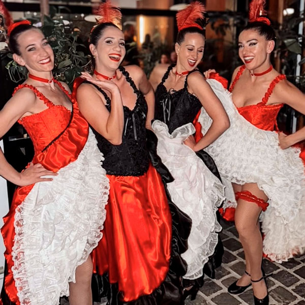 Danseuses de French CancanAmbiance cabaret parisien avec jupons, lever de jambe et musique entraînante. Des danseuses en frous-frous bleu blanc rouge pour un show music-hall pour vous faire revivre la grande époque des cabarets parisien. • A partir de 2 danseuses • Différents costumes au choix • Durée de la prestation : 3 passages French-Cancan ou 3 passages différents : Charleston / Plumes Cabaret / French-Cancan • Espace scénique à prévoir idéalement (5x3m pour 3 danseuses et 6x4m pour 4 danseuses) |