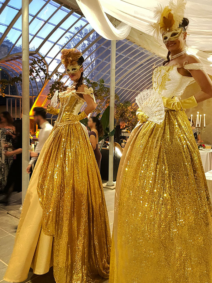 Offrez une touche spectaculaire à votre événement avec nos échassières Marquises, habillées de sublimes costumes baroques à paillettes dorées, alliant grâce et majesté pour une animation digne des salons royaux.
