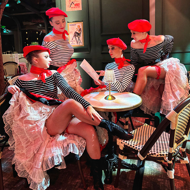 Danseuses de French CancanAmbiance cabaret parisien avec jupons, lever de jambe et musique entraînante. Des danseuses en frous-frous bleu blanc rouge pour un show music-hall pour vous faire revivre la grande époque des cabarets parisien. • A partir de 2 danseuses • Différents costumes au choix • Durée de la prestation : 3 passages French-Cancan ou 3 passages différents : Charleston / Plumes Cabaret / French-Cancan • Espace scénique à prévoir idéalement (5x3m pour 3 danseuses et 6x4m pour 4 danseuses) |