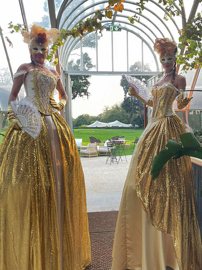 Offrez une touche spectaculaire à votre événement avec nos échassières Marquises, habillées de sublimes costumes baroques à paillettes dorées, alliant grâce et majesté pour une animation digne des salons royaux.